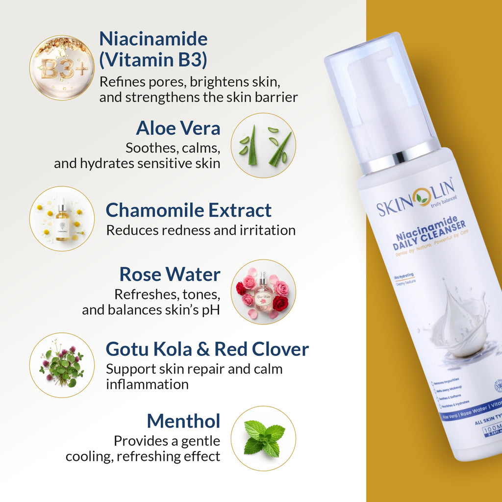 Unlike harsh cleansers that erode the skin barrier, Skinolin Gentle Cleanser uses skin-friendly actives and botanical extracts to cleanse with care. The blend of Niacinamide and plant-based ingredients supports barrier repair while preventing dryness and breakouts.